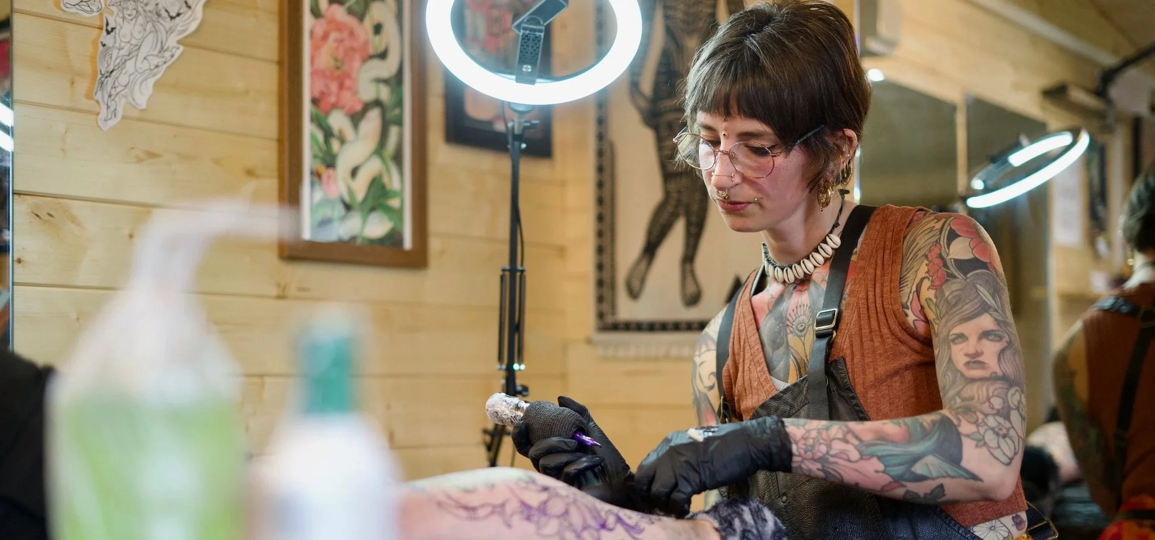 For smaller/fine line tattoos, I will likely just cling film the area. Keep it on until you get home. remove as soon as you’re home. use clean hands, warm water and antibacterial soap to give it a clean & remove excess ink.